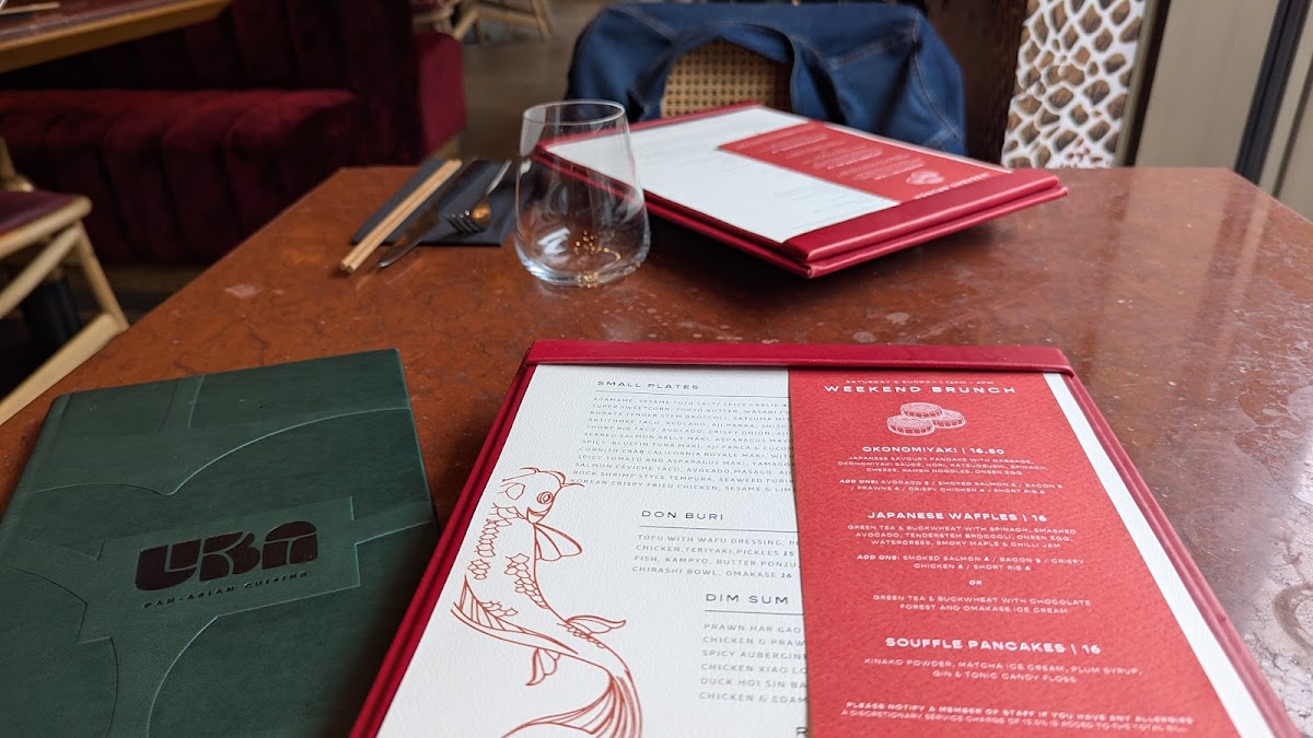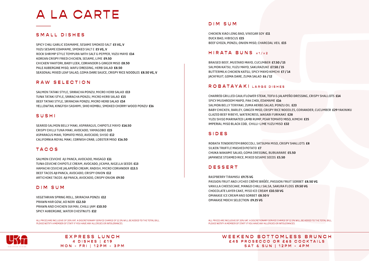Uba Restaurant’s menu at 61-67 Great Eastern St feels like a confident, pan-Asian “greatest hits” lineup-built for sharing, with plenty of variety from light bites to richer, robata-fired mains. The small plates set the tone with punchy, snackable options like Spicy Chili Garlic Edamame and Yuzu Sesame Edamame, alongside crowd-pleasers such as Rock Shrimp Style Tempura, Korean Crispy Fried Chicken, and Chicken Yakitori. If you’re after something cleaner and more refined, the raw section delivers with Salmon Tataki Style, Tuna Tataki Style, Beef Tataki Style, and Yellowtail Kingfish Sashimi-great choices for balancing out the heavier dishes. Sushi lovers are well covered too, from the indulgent Seared Salmon Belly Maki to bolder rolls like Crispy Chilli Tuna Maki, plus classics with a twist such as Asparagus Maki and California Royal Maki. The taco selection keeps things playful-Salmon Ceviche, Tuna Ceviche, Hamachi Ceviche, Beef Tacos, and Artichoke Tacos-while the dim sum and hirata buns add comfort and texture, including Vegetarian Spring Roll, Prawn Har Gow, Prawn and Chicken Sui Mai, Chicken Xiao Long Bao, and buns like Braised Beef, Salmon Katsu, Buttermilk Chicken Katsu, and Jackfruit. For bigger appetite moments, the robatayaki large dishes-Charred Grilled Cauliflower Steak, Spicy Mushroom Mapo, Salmon Belly Teriyaki, Baby Chicken, and Glazed Beef Ribeye-bring the menu to a satisfying finish, especially paired with sides like Robata Tenderstem Broccoli or Japanese Steamed Rice. And to close, the desserts-Raspberry Tiramisu, Passion Fruit and Lychee Crème Brûlée, Vanilla Cheesecake, Chocolate Layer Cake, and Omakase Ice Cream and Sorbet-round things off with something for every kind of sweet tooth.